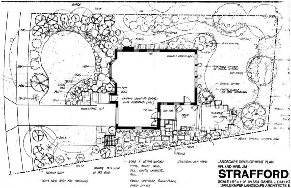 This complete landscape renovation included a wrap around front landscape planting, extending the front walk, and additional parking for the narrow driveway. The house lacked dimension and we recommended a cover for the front door that was echoed in an arbor entry to the back yard. (as seen in the sketch) The owner agreed and had these improvements installed. The backyard garden was designers for privacy for a hot tub and sitting area, as well as some gardening areas. This plan shows the development of the outdoor spaces.